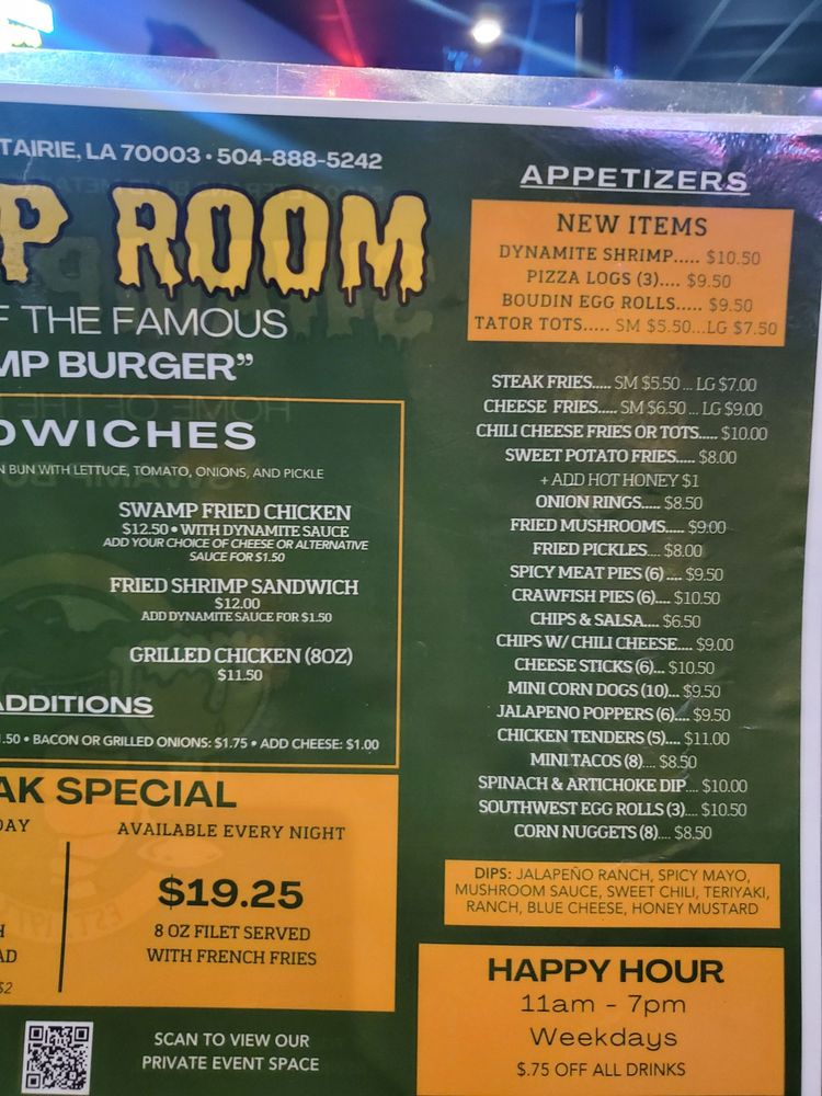 For reservations or takeout, call (504) 888-5242 today and get ready for an unforgettable experience at The Swamp Room!